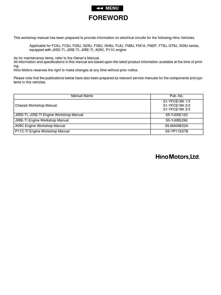 This workshop manual has been prepared to provide information on electrical circuits for the following hino vehicles.
